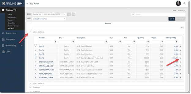 After creating a job, importing quantities, applying Spec Sets, and generating a Bill of Materials (BOM), you can manually adjust SKU quantities directly on the Job BOM page. Manual edits allow you to make final corrections or project-specific adjustments before exporting or sharing the BOM.