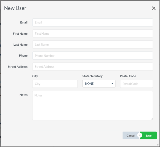 - Fill in the email, name, phone, and address fields. The email you enter will be the user’s login ID.